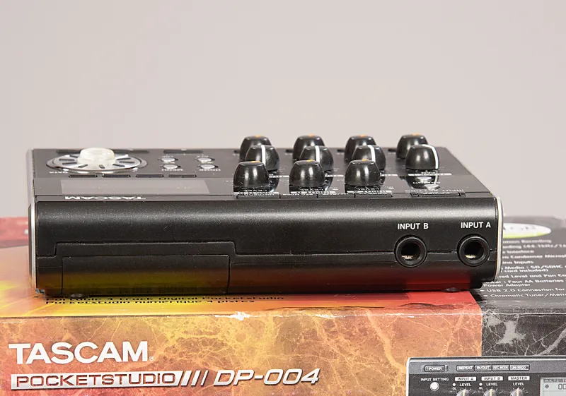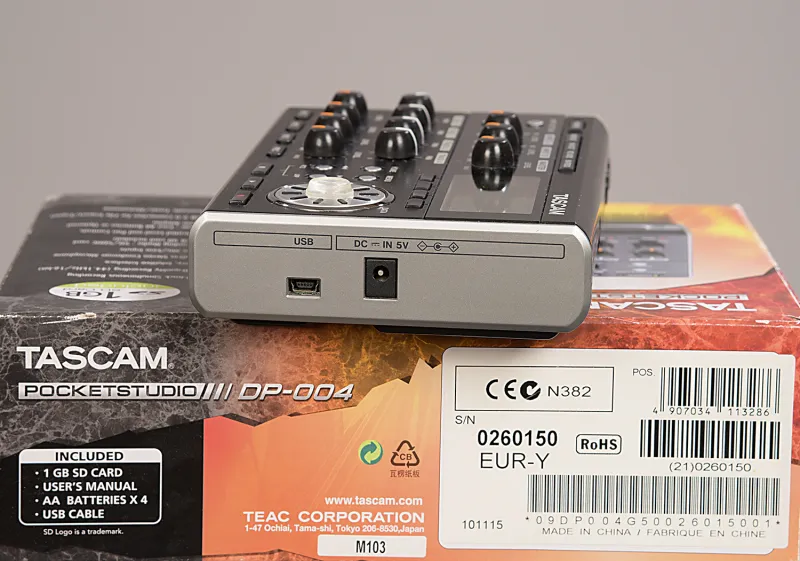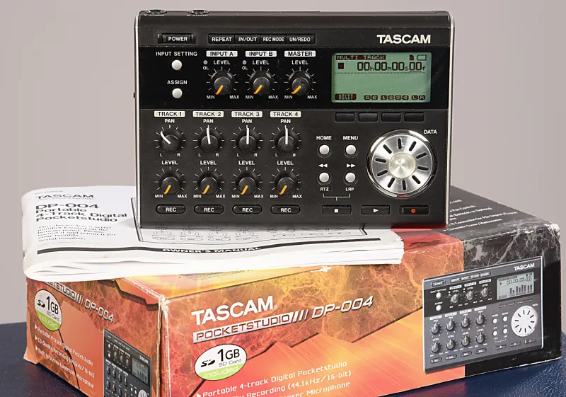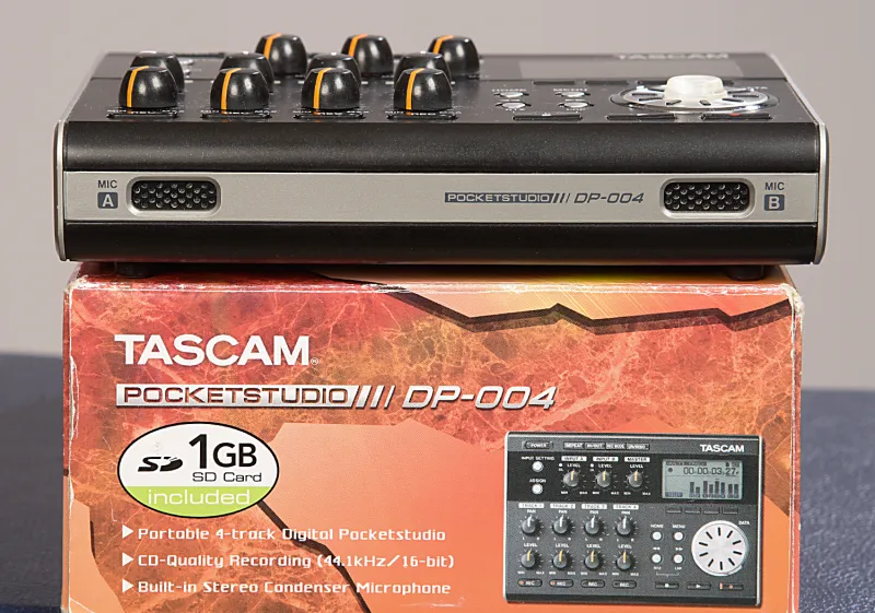 Tascam DP-004Digtális felvevő: hordozható 4 sávos rögzítő, 44.1 kHz / 16 bit, 2 szám felvétele egyszerre, 4 sáv egyidejű lejátszása, SD / SDHC kártya, beépített sztereó kondenzátor mikrofon, 2 mikrofon / vonal bemenet (6.3 mm jack), fejhallgató / line kimenet (3.5 mm-es mini jack), szint és panoráma kontrollok minden csatornán, Bounce funkció, sztereó master sáv, kereső funkció, vágó funkció, Undo / Redo funkció, LCD kijelző, USB 2.0 port, 4 x AA elem vagy opcionális AC adapter, méretek: 155 x 34 x 107 mm, tömeg: 360 g