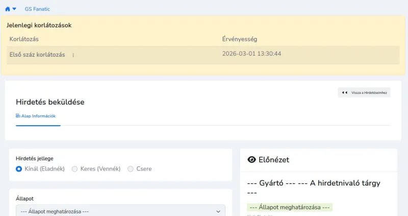 2026.02.28. 13:39:29A korlátozás ideje alatt a hirdetés elérhető, ugyanúgy reagálhatnak rá, google keresőből megtalálható. A mi listáinkban nem jelenik meg. Úgy látom a korlátozásod hamarosan lejár és akkor minden mehet a régiben.