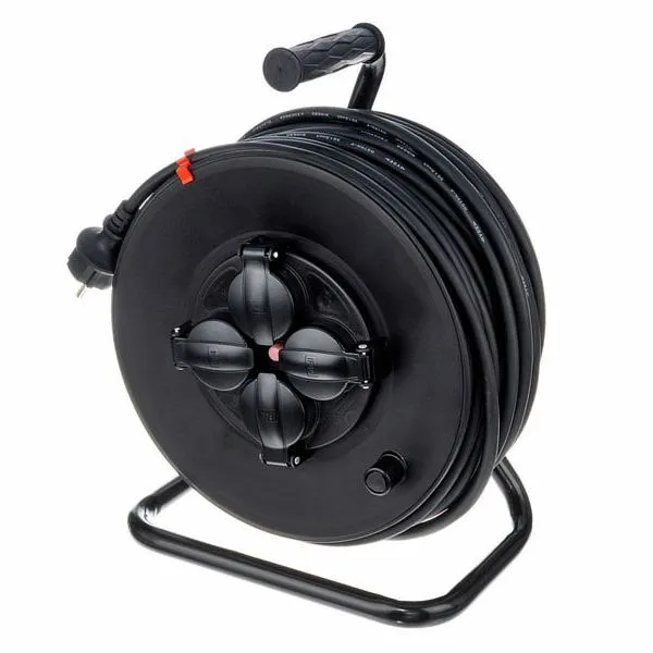 Cable Drum The 50 m long earthed cable drum with IP44 plug and sockets is ideal for outdoor use.The black design of the sockets and housing is ideal for all event sites.